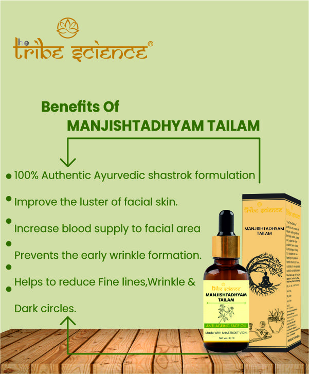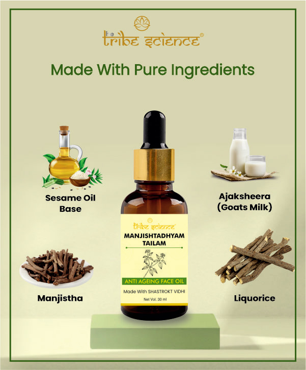 TheTribe Science “ MANJISHTADHYAM THAILAM is a traditional Authentic Ayurvedic formulation made with finest and rarest ingredients including Manjishtha, Liquorice, Laksha, Matulunga, Ajaksheera (goats milk) in a sesame oil base
