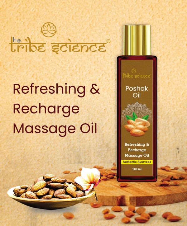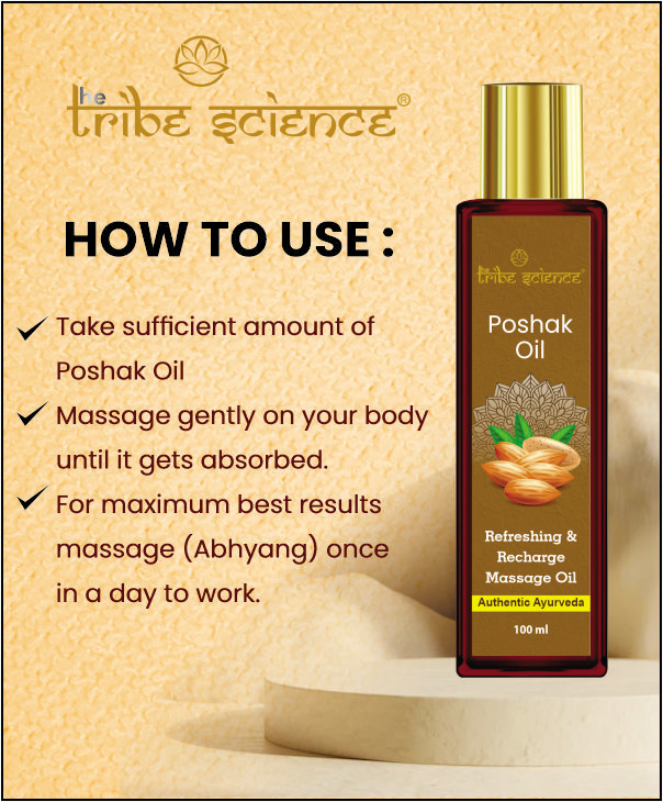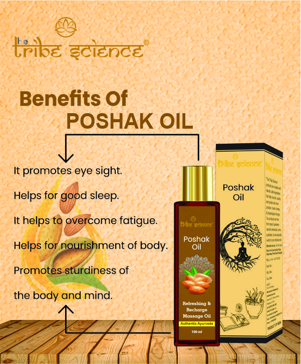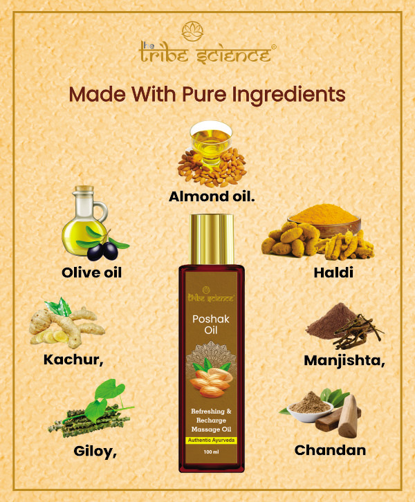 TheTribe Science “POSHAK OIL is a traditional Authentic Ayurvedic formulation made with finest and rarest ingredients including swalpchandanadi tailam (bharangi, adusa, kantakari, bala, giloy, svet chandan, agar, talishpatra, nakhi, manjishta, padmakh, motha, kachur, laksha, haldi, daruhaldi, lalchandan, sesame oil base), olive oil,almond oil.